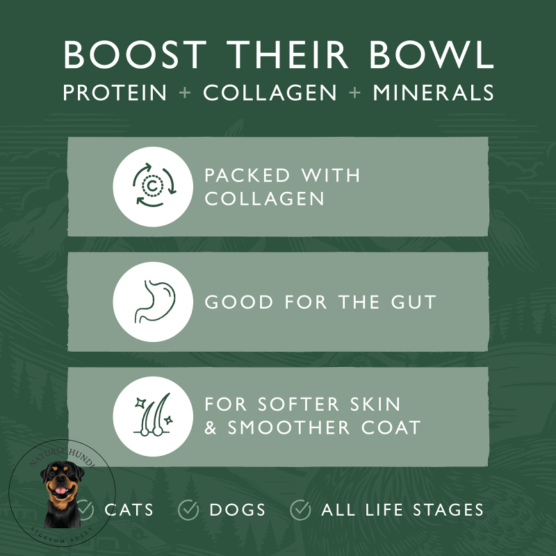 Giv din hund eller kat et naturligt og næringsrigt boost med denne lækre bouillon, der er fyldt med protein, kollagen og essentielle mineraler. Den simres langsomt for at udvinde de bedste næringsstoffer, som hjælper med at støtte led, fordøjelse, immunforsvar og hydrering.