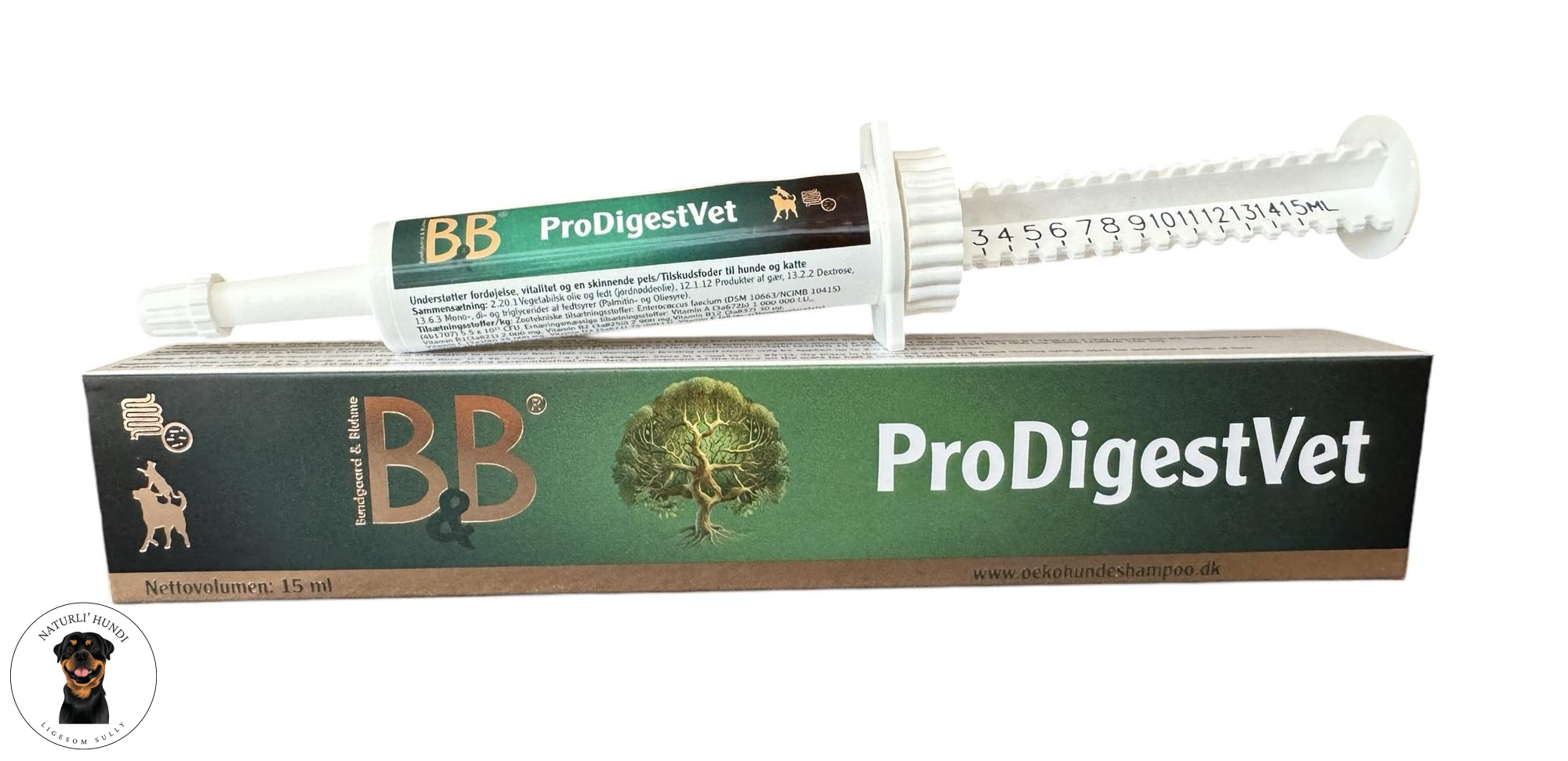 B&B ProDigestVet 15 ml er et avanceret tilskudsfoder med en kombination af effektive pro- og præbiotika, der hjælper med at genoprette og opretholde en sund fordøjelse. 🐾✨ Produktet er ideelt til hunde og katte med mave- og tarmproblemer og kan bruges både forebyggende og som støtte i stressede situationer, efter medicinsk behandling eller ved fordøjelsesproblemer.
