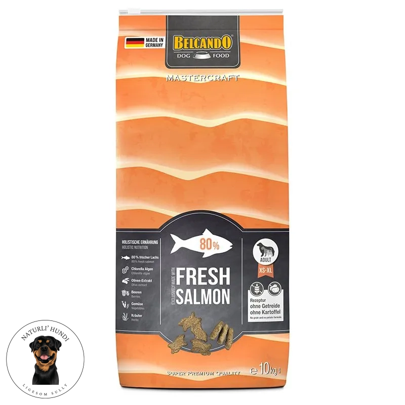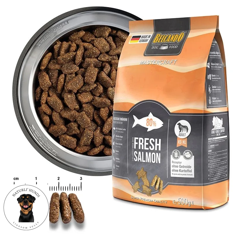 Belanco Mastercraft med laks er et førsteklasses hundefoder, der er skræddersyet til hunde, som har brug for et nærende og smagfuldt måltid 🐟. Med en høj andel af frisk laks som hovedingrediens sikrer foderet et højt indhold af letfordøjelige proteiner, som bidrager til en stærk muskulatur og giver energi til en aktiv hverdag.