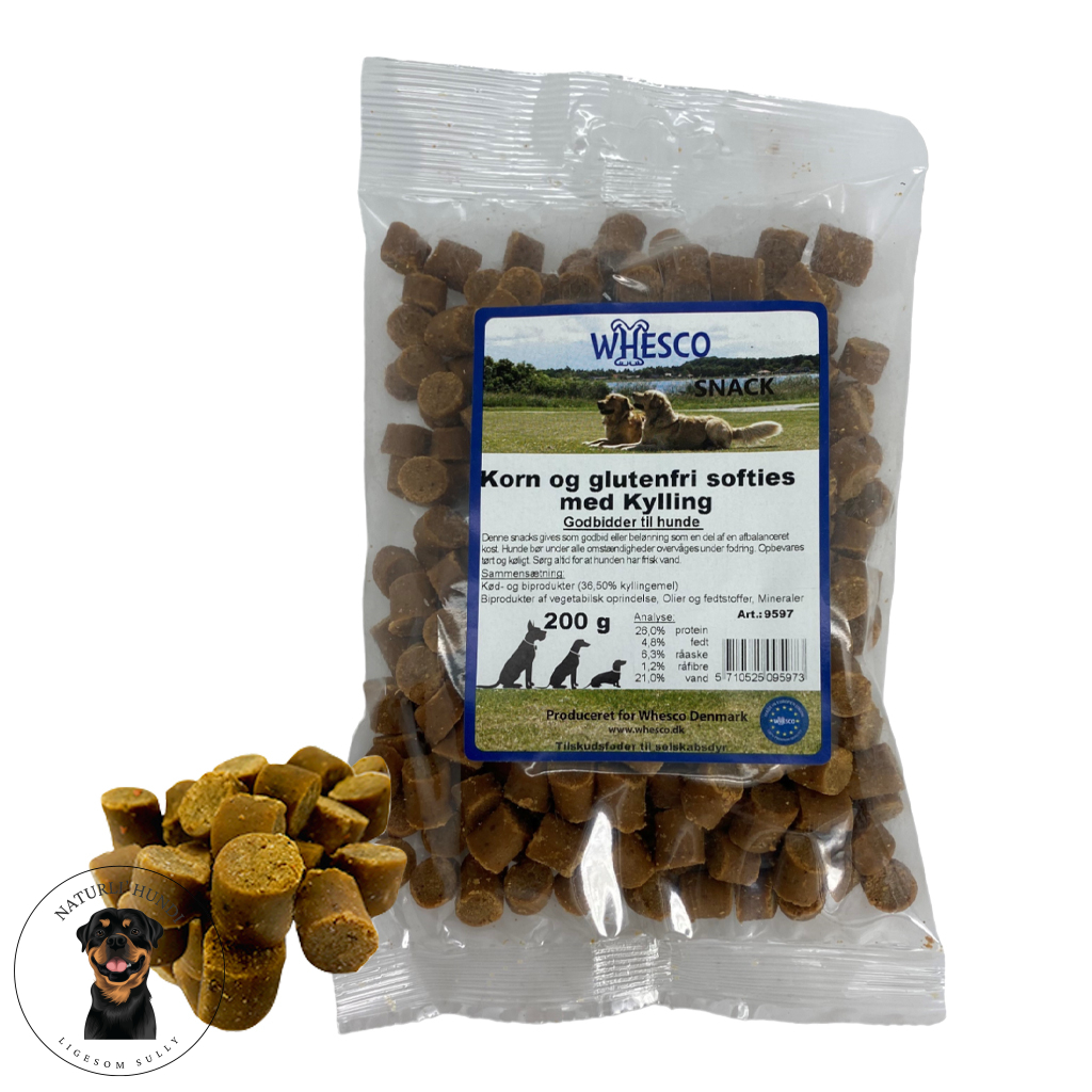 • Naturlige ingredienser: Whesco Softies kylling godbidder er lavet af høj kvalitet, med naturlige ingredienser uden korn, gluten, kunstige tilsætningsstoffer,  eller konserveringsmidler.