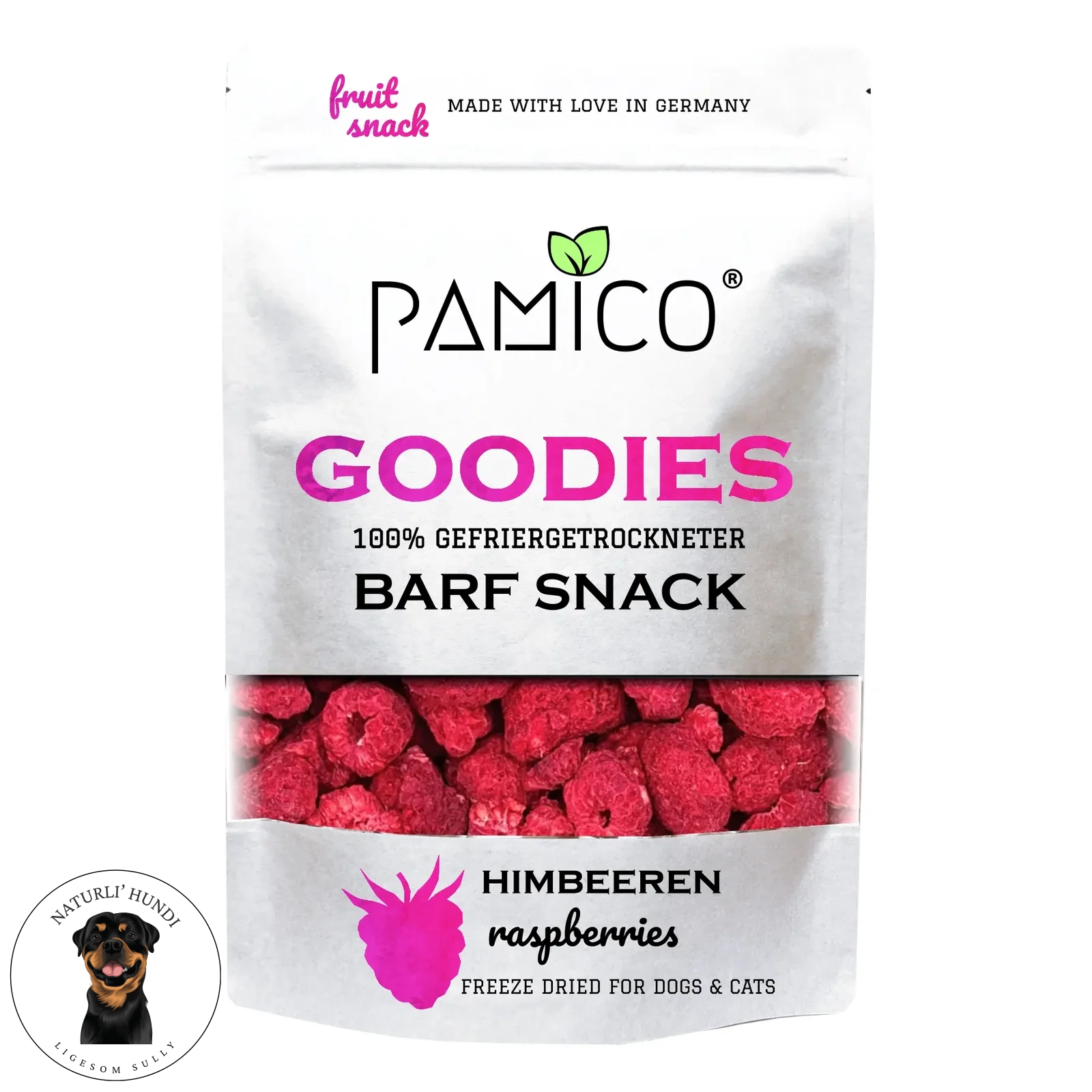 Vores frysetørrede hindbær er en lækker, let og ekstremt næringsrig snack, som både hunde og katte elsker.
