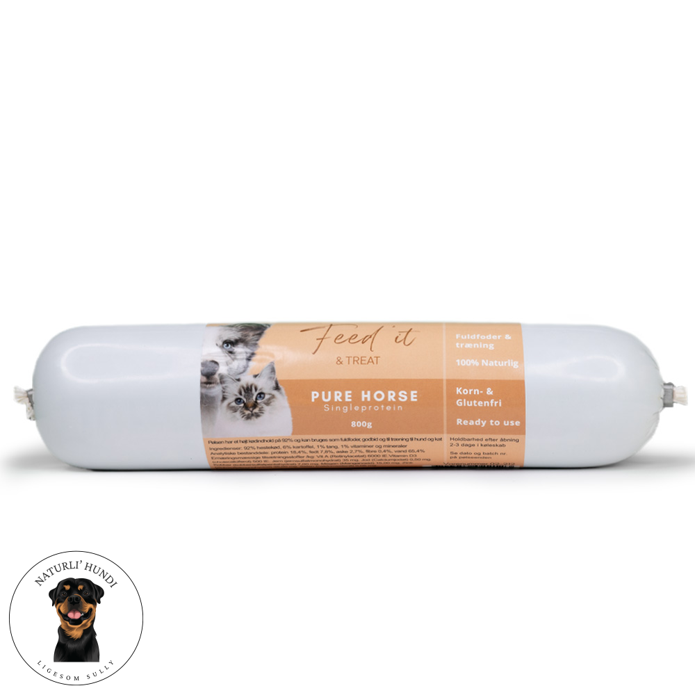Feed’it & Treat Pure Horse er en naturlig og alsidig kødpølse med hele 92% hestekød 🐴💚. Den er fremstillet af rene råvarer og kan bruges som fuldfoder, HØJ belønnings godbid eller som topping – perfekt til både hunde og katte.
