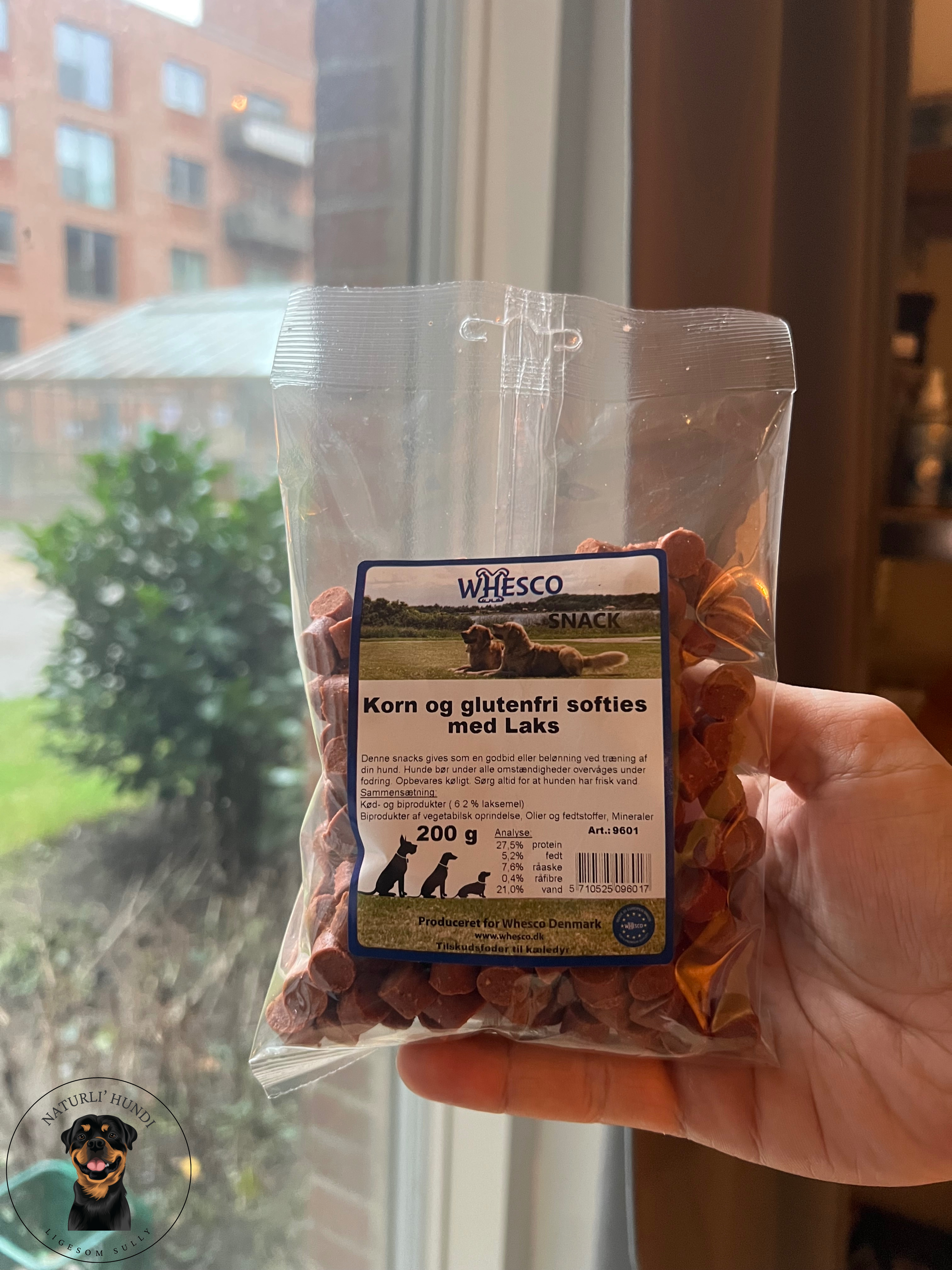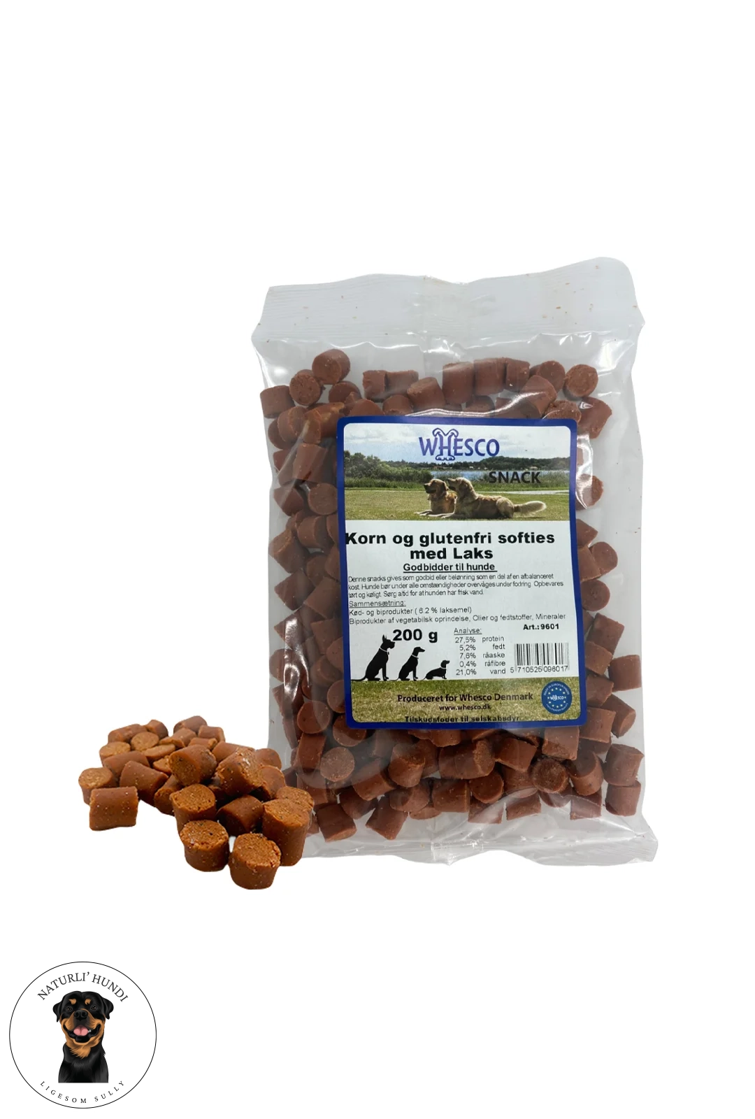 Den bløde konsistens gør dem nemme at tygge og derfor velegnede til alle hunde – fra hvalpe til seniorhunde. Whesco Softies med laks er fremstillet uden korn og unødvendige tilsætningsstoffer, hvilket gør dem velegnede til hunde med foderintolerancer.