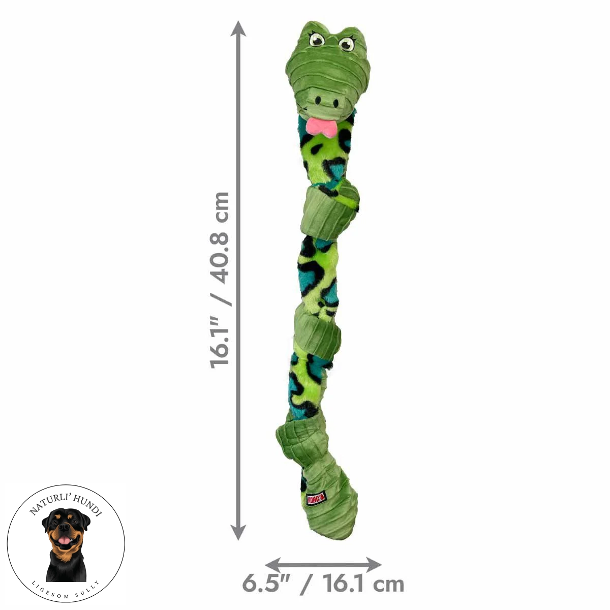 KONG Knots Snake måler 62,5x7,5x10 cm og er en oplagt kombination af plyslegetøj og knyttet reb, der stimulerer hundens naturlige instinkter.